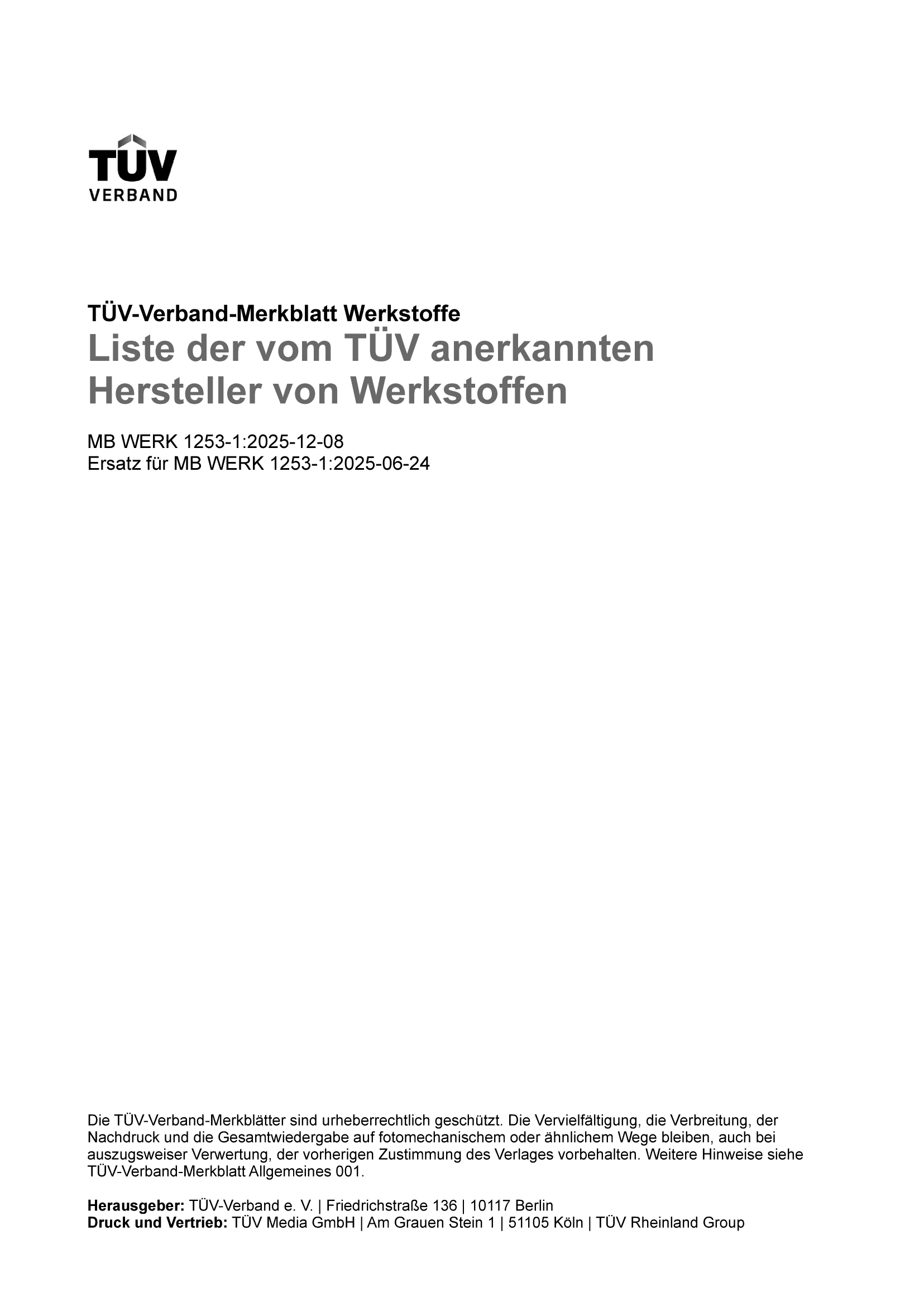| Description | Die Liste enthält alle bis zum Ausgabedatum von einem TÜV überprüften interantionalen Hersteller von metallischen Werkstoffen. Sie wird halbjährlich neu herausgegeben. |