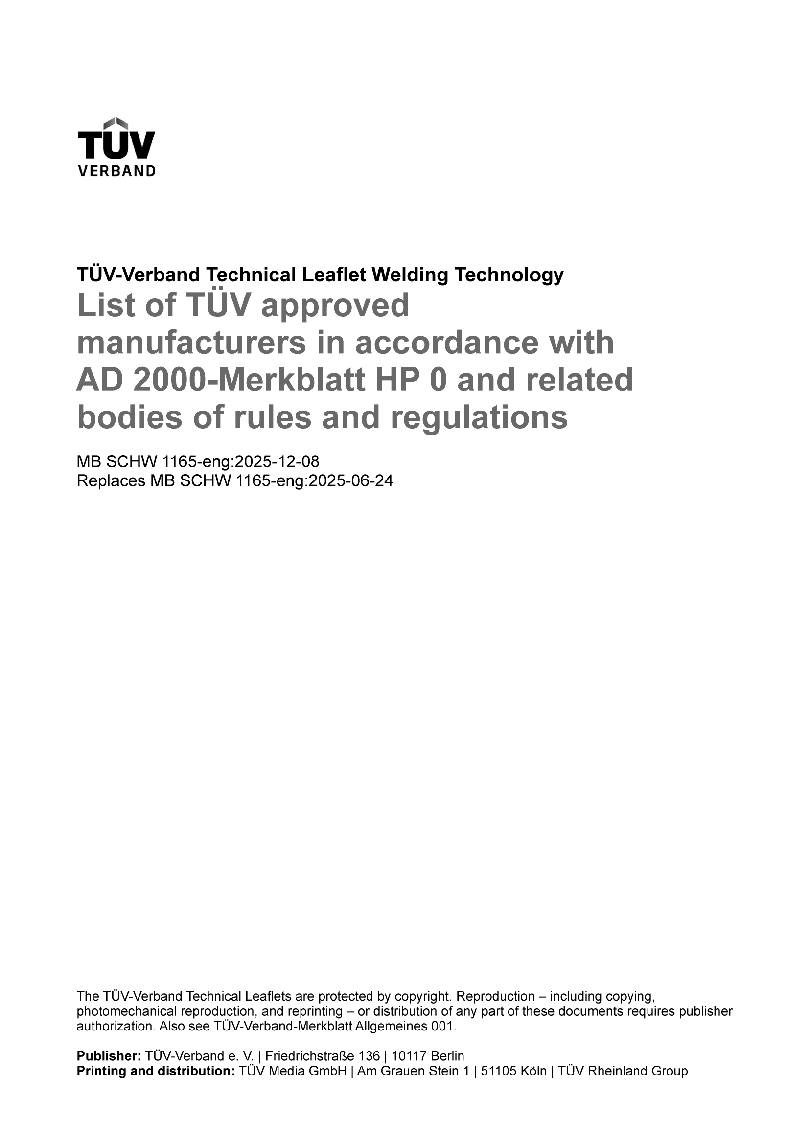 | Name | List of TÜV approved manufacturers in accordance with AD 2000-Merkblatt HP 0 and related bodies of rules and regulations |