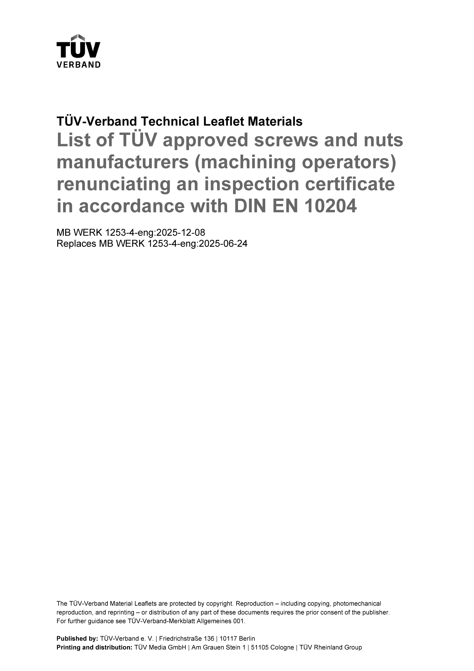 | Beschreibung | The list comprises all screws and nuts manufacturers (machining operators) which have been inspected, before the date of issue, by an expert of a Technical Supervi-sory Organisation. It is reissued biannually. |