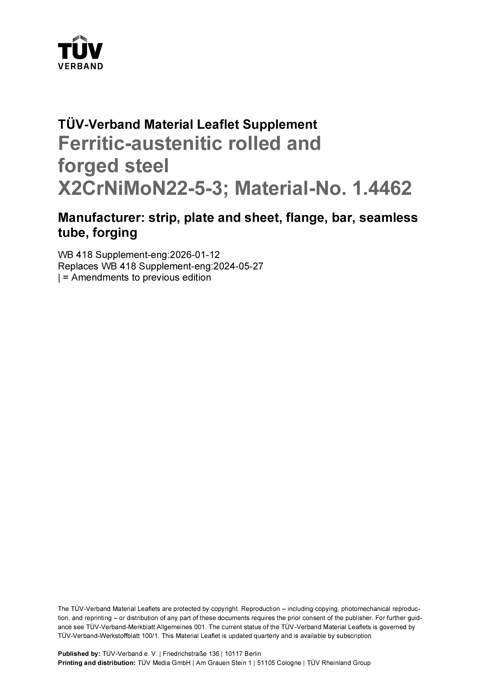 | Name | Ferritic-austenitic rolled- and forged steel X2CrNiMoN22-5-3; Material-No. 1.4462; Manufacturer: strip, plate and sheet, flange, bar, seamless tube, forging |
